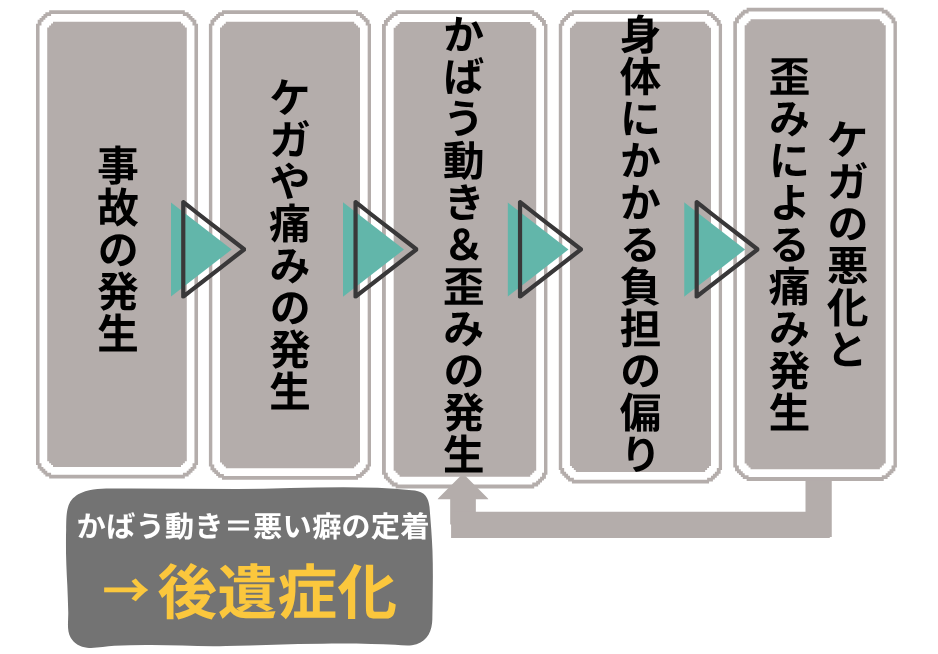 後遺症化の大きな原因のひとつが 「痛みをかばう動き」 です。