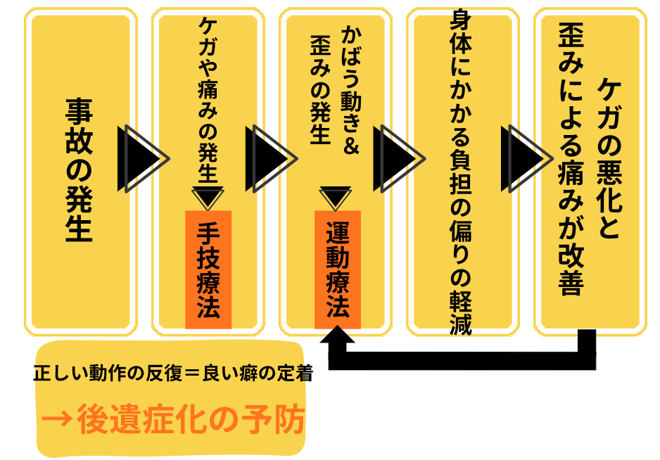 事故で乱れた体の使い方を修正し、正しい動きを再学習する